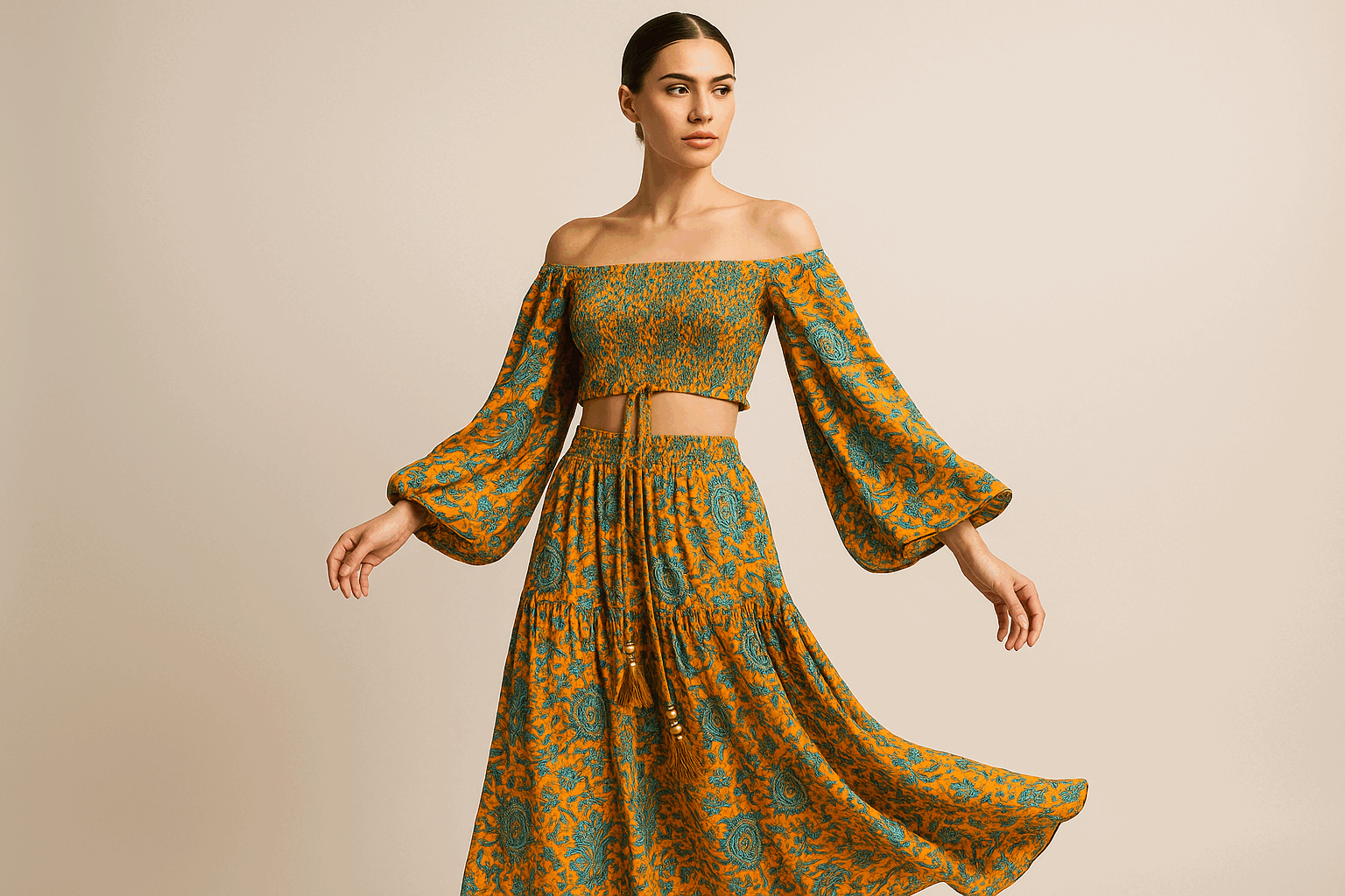 Αυτό το μοναδικό paisley set ινδικής προέλευσης σε εκπληκτικό πορτοκαλί χρωματισμό με τυρκουάζ και πολύχρωμα paisley μοτίβα είναι η τέλεια επιλογή για boho chic εμφανίσεις. Περιλαμβάνει crop top με off-shoulder design, μακριά μανίκια και maxi φούστα με smocked ελαστική μέση.