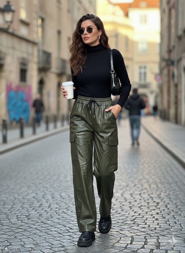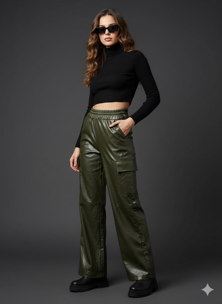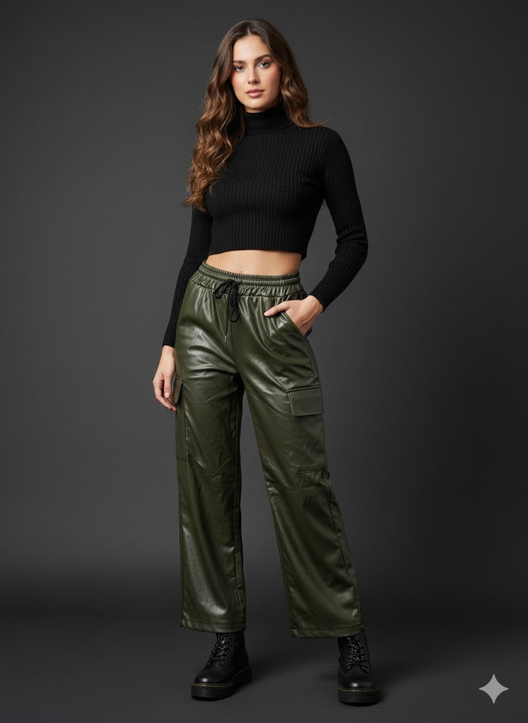 Ξεχωρίστε με αυτό το εντυπωσιακό cargo παντελόνι από τεχνητό δέρμα σε στρατιωτικό λαδί χρώμα, που συνδυάζει streetwear στυλ με urban κομψότητα.