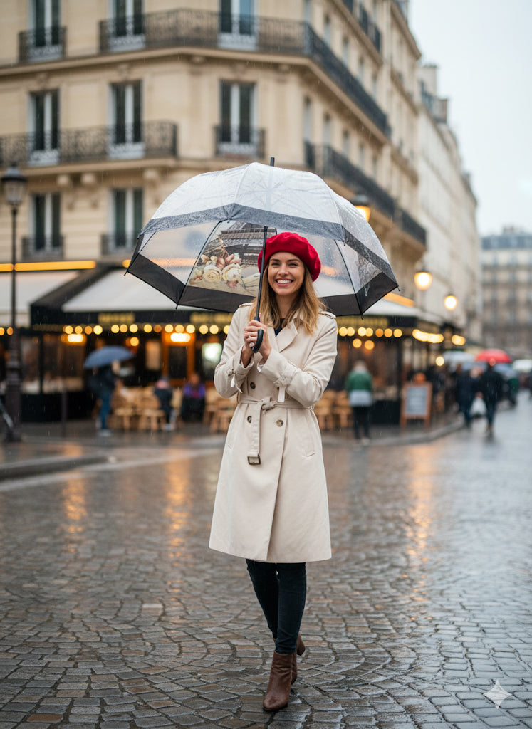 Styling Tips: Η διαφανής ομπρέλα σας επιτρέπει να απολαμβάνετε τη θέα ακόμα και στη βροχή, ενώ το ρομαντικό σχέδιο με τον Πύργο του Άιφελ προσθέτει μια πινελιά παριζιάνικης κομψότητας. Το vintage θέμα με τα τριαντάφυλλα και τα χειρόγραφα δημιουργεί μια νοσταλγική, ρομαντική διάθεση.