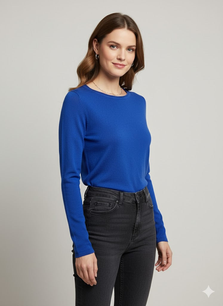 Κλασική μακρυμάνικη μπλούζα σε μπλε από λεπτό πλεκτό ύφασμα, απαραίτητο basic κομμάτι για κάθε γκαρνταρόμπα.