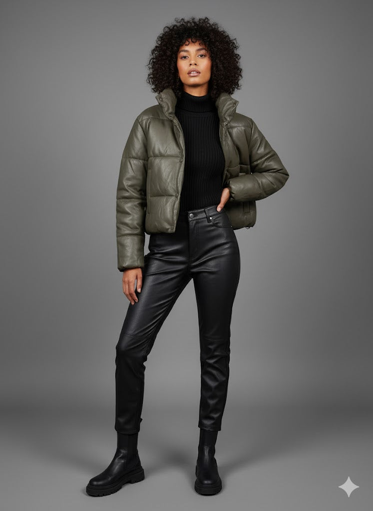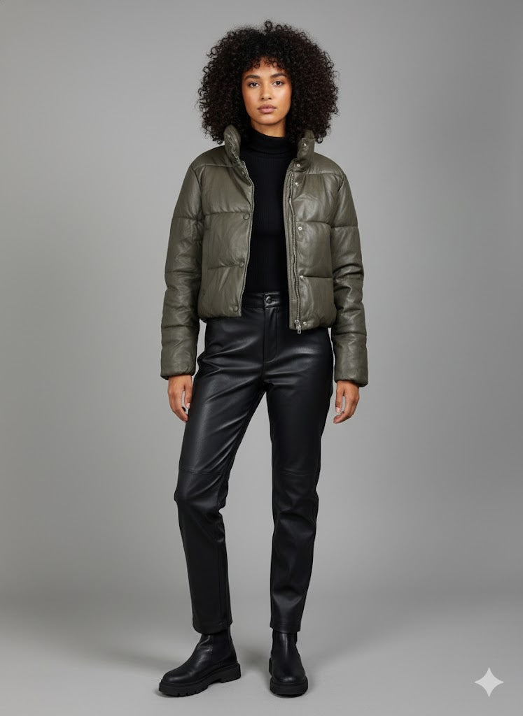 Γυναικείο Puffer Μπουφάν Κοντό Δερματίνη Χακί | C&M
