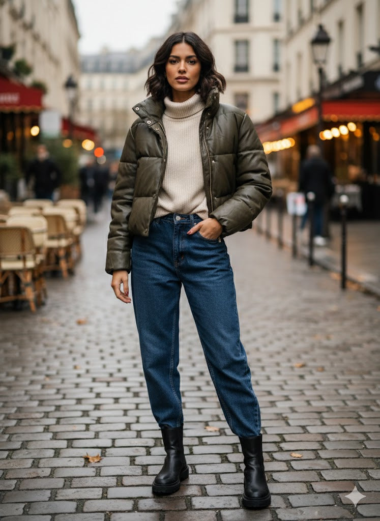 Μοντέρνο κοντό puffer μπουφάν από συνθετικό δέρμα με γυαλιστερή υφή, ιδανικό για casual και στυλάτες εμφανίσεις.