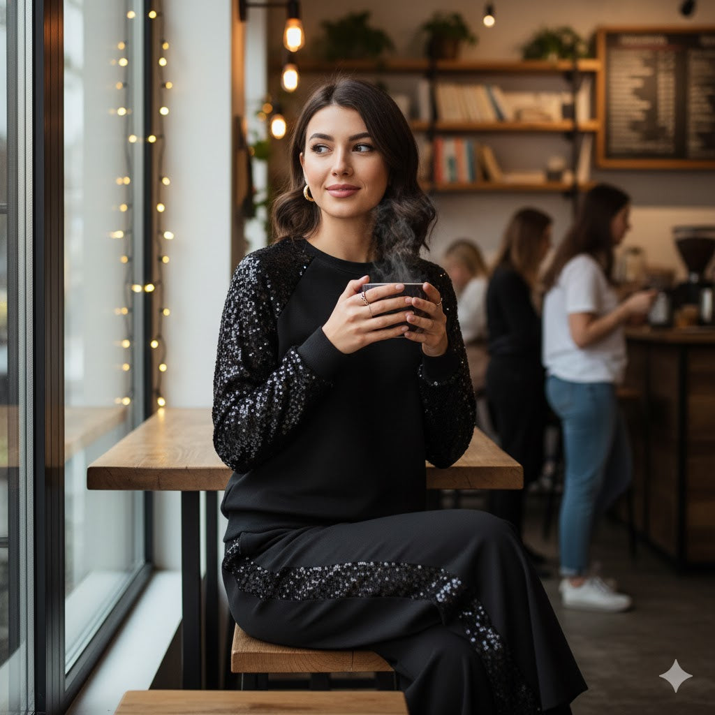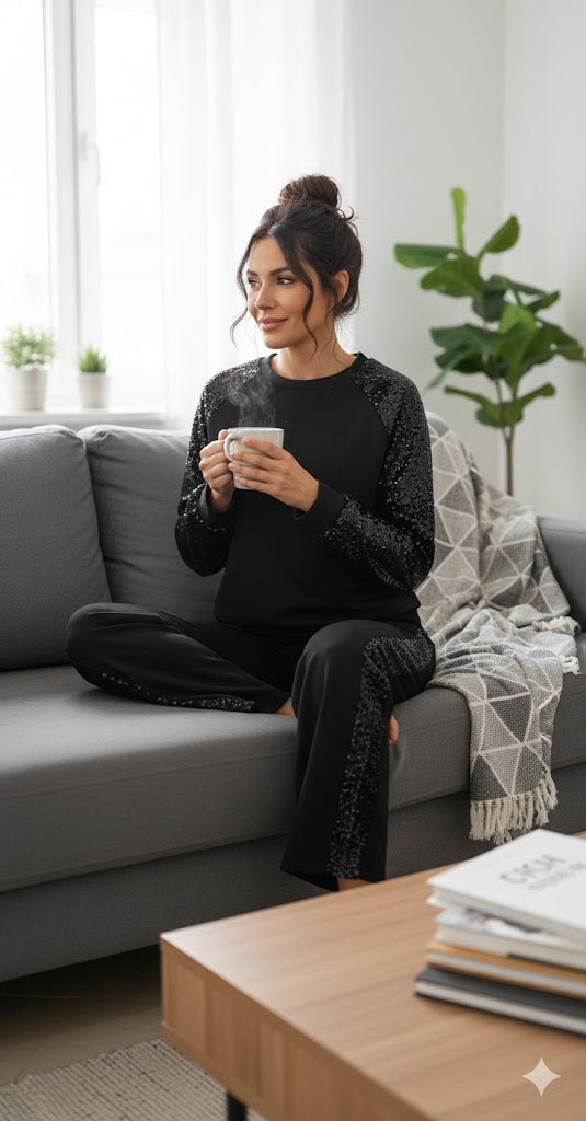 Ξεχωρίστε με στυλ! Αυτό το εντυπωσιακό μαύρο σετ συνδυάζει την άνεση του casual ντυσίματος με τη λάμψη των παγιέτων. Το τέλειο σύνολο για όσες αγαπούν το κλασικό μαύρο με μια πινελιά glamour.