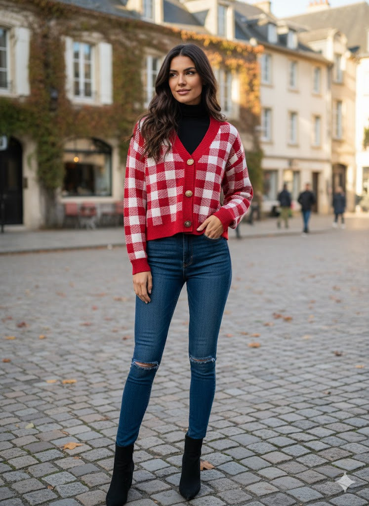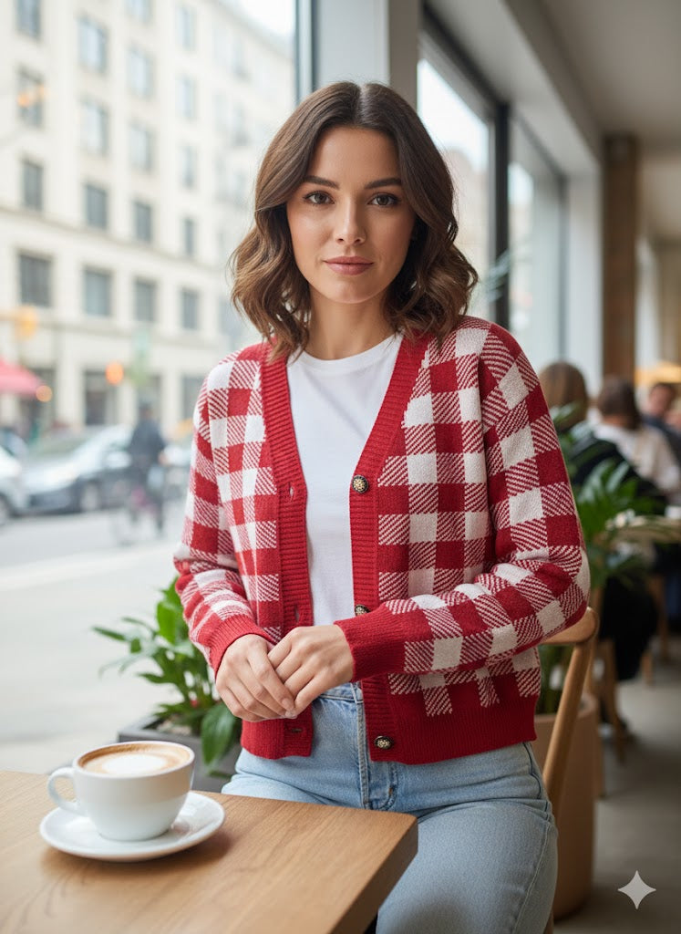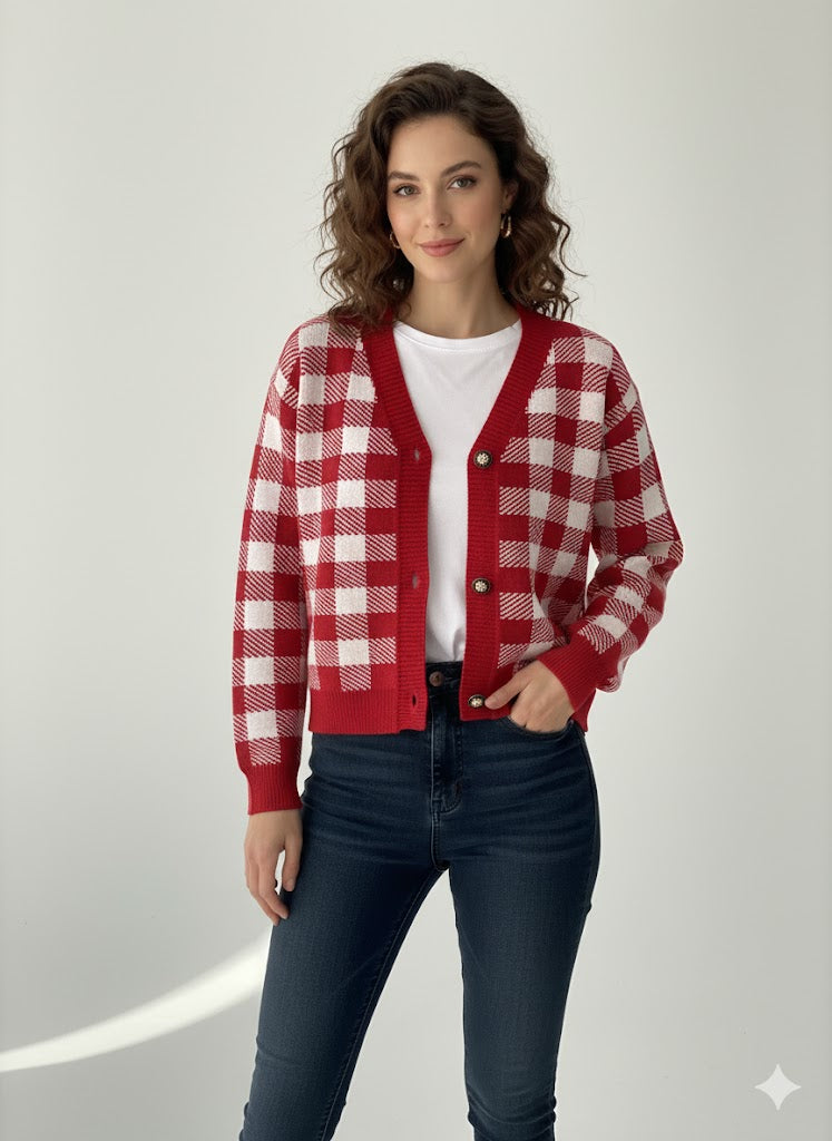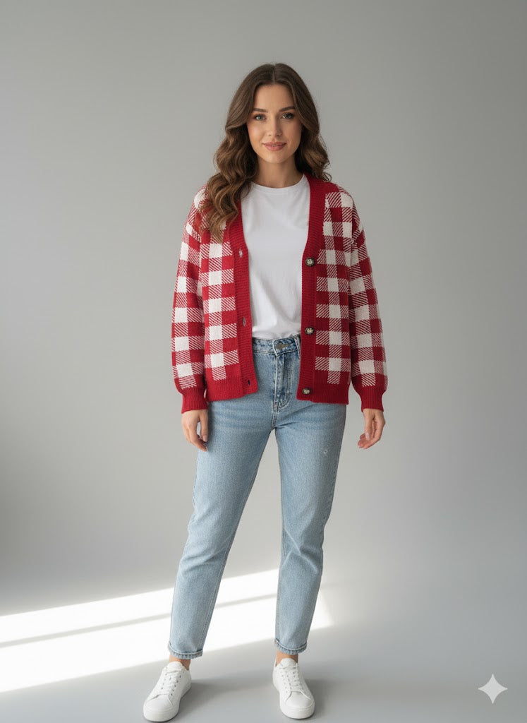Αυτή η εντυπωσιακή πλεκτή ζακέτα με έντονο σχέδιο καρό σε κόκκινο και λευκό είναι η τέλεια επιλογή για να προσθέσετε χρώμα και στυλ στην καθημερινή σας γκαρνταρόμπα.