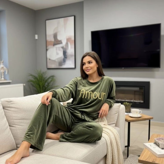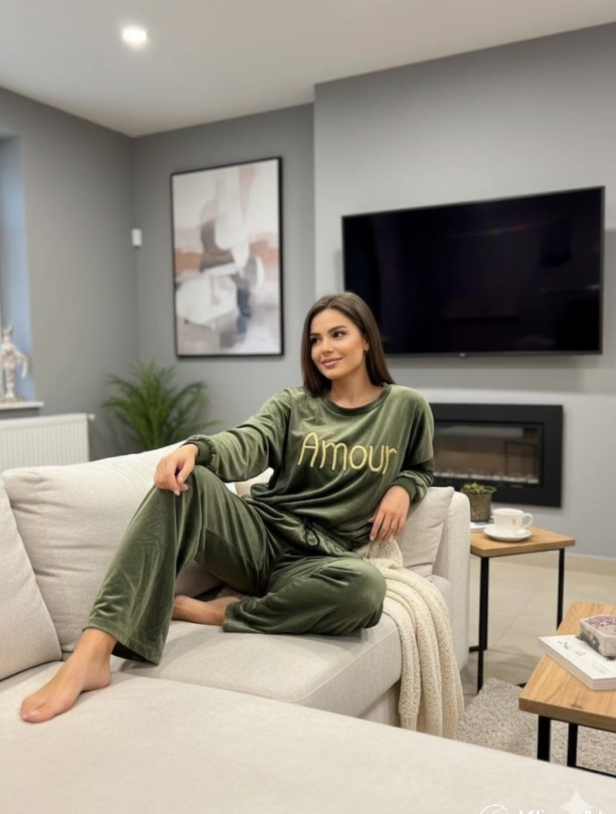 Ανακαλύψτε το απόλυτο σετ άνεσης με το βελούδινο σετ Amour σε υπέροχο χρώμα olive green. Αυτό το δύο τεμαχίων σετ συνδυάζει την πολυτέλεια του βελουδιού με το μοντέρνο στυλ για μια εμφάνιση που ξεχωρίζει.